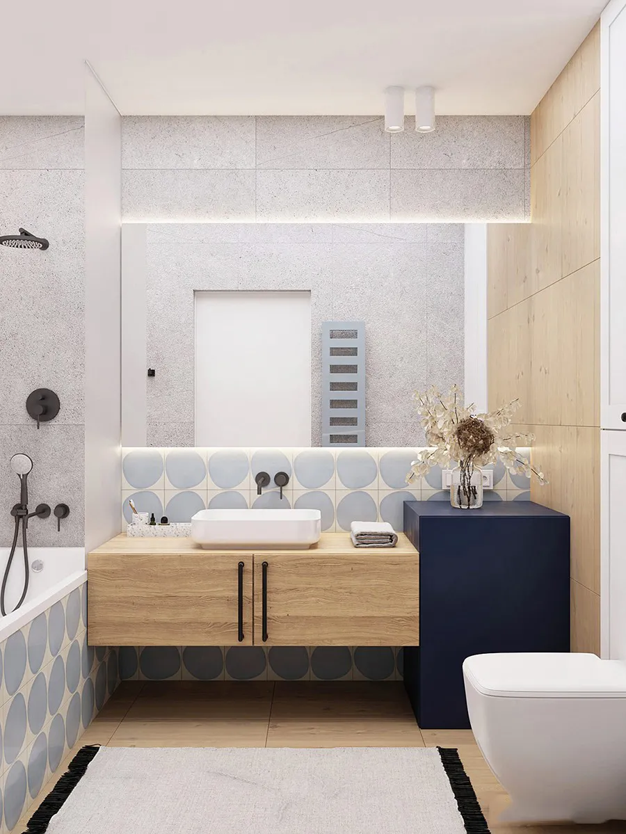 卫生间色调清新,浅蓝、深蓝、白色、原木色搭配,毫无违和感。深蓝色的柜子嵌入洗衣机,时尚又大气。