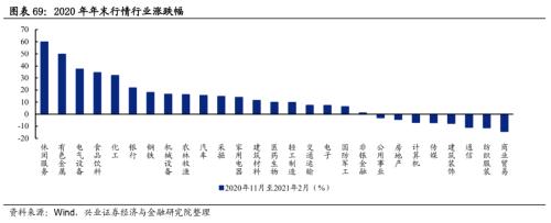 顺周期与消费领涨市场。随着国内经济持续复苏,顺周期板块兼具业绩与估值性价比,自2020年三季度开始已有所表现,有色金属、化工、钢铁等行业在年末行情中延续优势,领涨市场;而随着国内经济复苏由上半场步入中场,不确定性增加,市场对业绩增长确定性的要求开始提升,也使得龙头抱团极致演绎,休闲服务、食品饮料、新能源等板块的核心资产在资金的集中涌入下估值溢价显著提升并逐渐走向泡沫化。