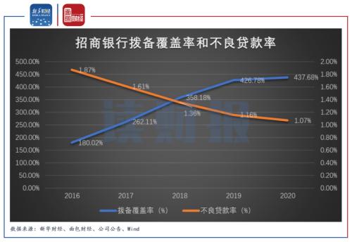 在此基础上,2020年末,招行拨备覆盖率达437.68 %,同提升10.9个百分点,保持了较好的风险抵补能力。