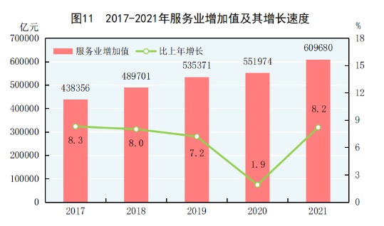 全年批发和零售业增加值110493亿元,比上年增长11.3%;交通运输、仓储和邮政业增加值47061亿元,增长12.1%;住宿和餐饮业增加值17853亿元,增长14.5%;金融业增加值91206亿元,增长4.8%;房地产业增加值77561亿元,增长5.2%;信息传输、软件和信息技术服务业增加值43956亿元,增长17.2%;租赁和商务服务业增加值35350亿元,增长6.2%。全年规模以上服务业企业营业收入比上年增长18.7%,利润总额增长13.4%。