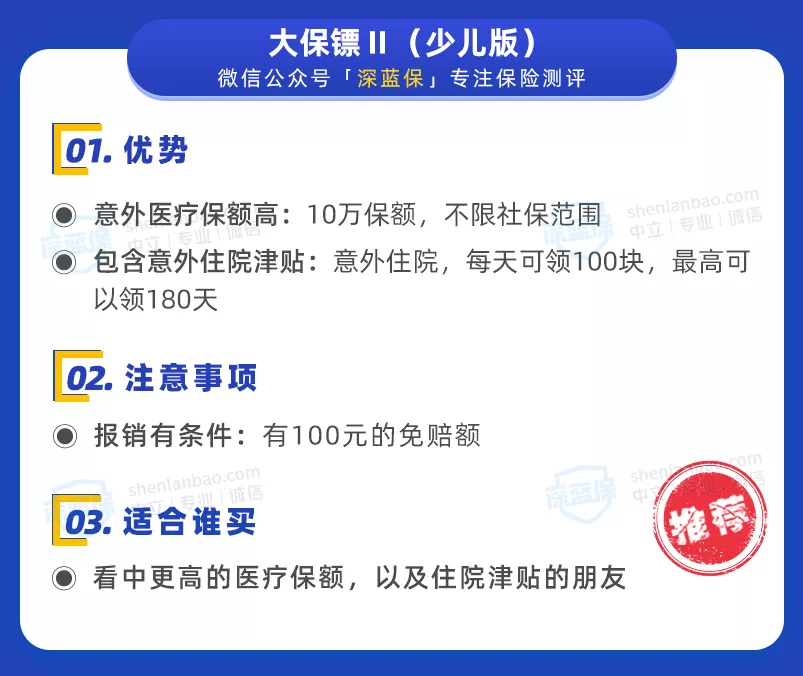 大保镖Ⅱ(少儿版)意外医疗的保额很高,整体也是比较全面的,具体优劣势如下: