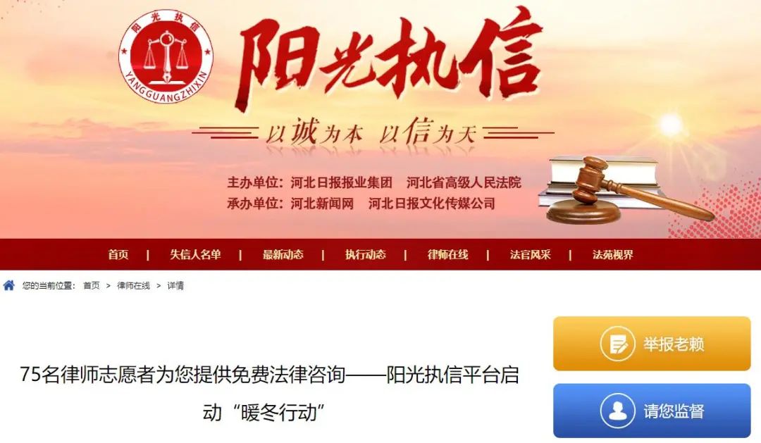 03 12月16日起,阳光执信平台启动“暖冬行动”,由75名律师志愿者组成的“金牌律师团”,通过线上线下多种方式提供免费法律咨询。