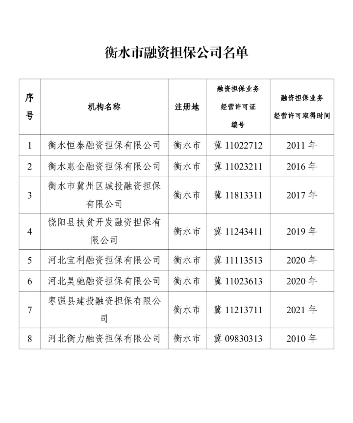 衡水市地方金融监督管理局近日发布《关于公示全市地方金融组织名单的公告》,对全市小额贷款公司、融资担保公司、典当行等地方金融组织名单进行公示。