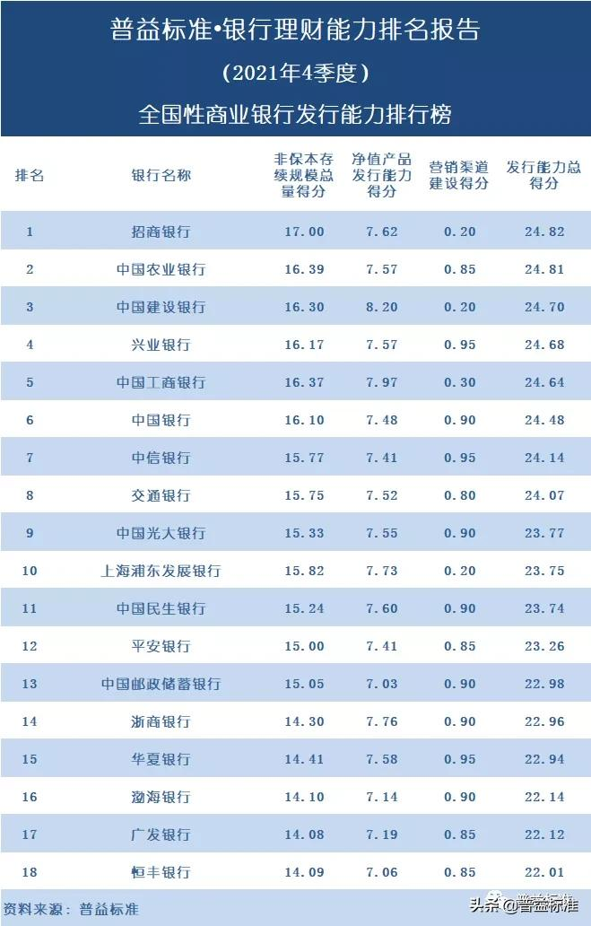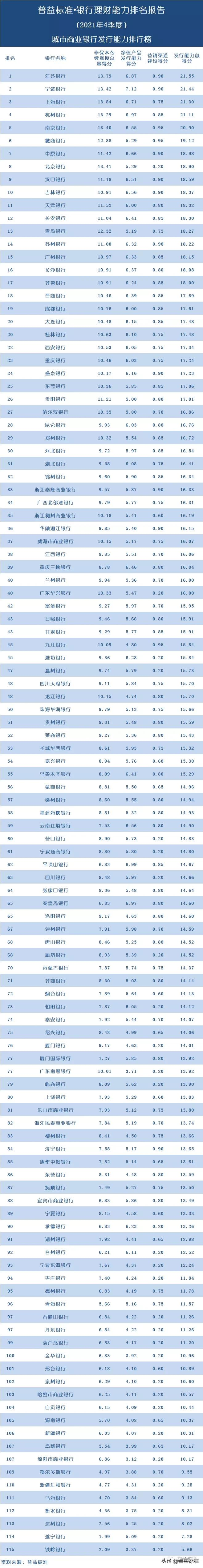 表1:银行理财能力综合排行榜(2021年4季度)