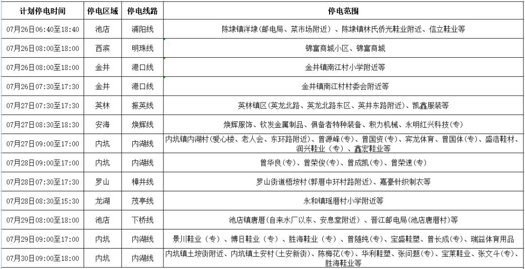 因客户工程,配改工程,用户申请,市政工程,低压工程需要,拟对下列线路进行停电,请停电范围内各用电户做好准备。若遇下雨等特殊原因,可能取消相应区域停电。实际送电时间以现场施工进度为准。给您造成不便,敬请谅解,感谢您的支持!安全提示:在停电期间,线路随时可能恢复送电,任何单位和个人应当遵守《电力法》,《电力设施保护条例》等有关法律法规的规定,不得攀登变压器台架及杆塔,禁止盗窃,破坏电力设施,禁止在电力设施保护区内从事法律法规所禁止的行为,否则,将自行承担法律责任。电力统一报修服务电话:95598,晋江区域用户可拨打:82558255。