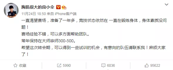 大家肯定知道蚕豆君说的是谁了,没错,就是伞皇,伞皇经过解说杯的洗礼之后发现自己仍然热爱着赛场,享受着电子竞技的快乐,即使没能在解说杯上带领队伍更进一步,但对他来说,却成为了复出的契机,于是已经28岁的他发布微博直接宣布复出,并表示希望能有队伍给他试训的机会。