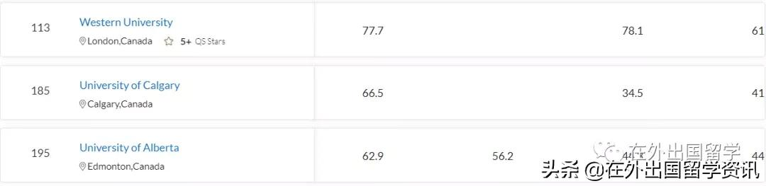 ,这一维度的分数可以反映出雇主在学校的活跃度,以及可以提供多少研究机会或招聘机会等,也可以看出毕业生在就业时是否选择面广、签约率高、满意率高。该榜单的前200名中,加拿大院校有5所:拉瓦尔大学、滑铁卢大学、麦克马斯特大学、阿尔伯塔大学、多伦多大学。