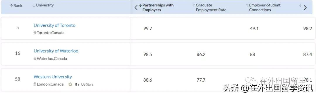 上榜QS毕业生就业能力排名前100名的加拿大院校中,我们