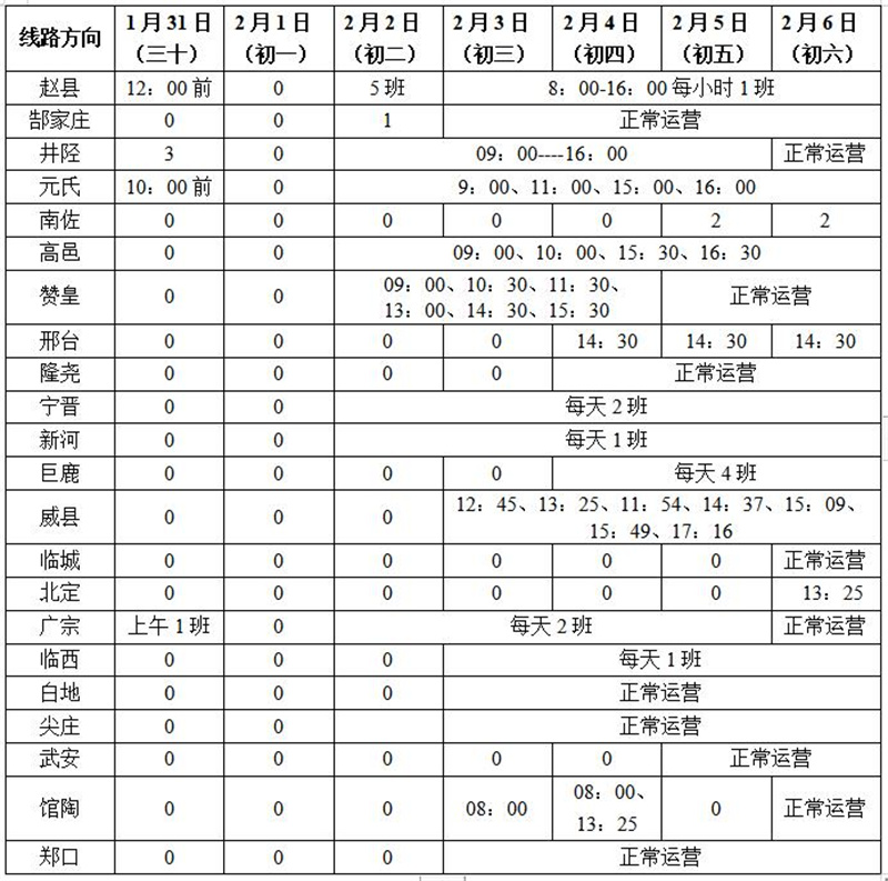 注:1.临城方向车辆自2022年1月22日起停发,如无特殊情况2月6日正常运营。