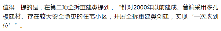 一类是拆迁类中“能拆迁的多孔板材等老旧危房”。这类房子有一个共同点,大多处于老城区,城市的核心地段,由于都是现浇或预制的板材建设,建设时代久远不说,70、80,甚至90年代建造居多,更重要的是这种结构不抗震、危险系数高,不少房子事实上是不能居住的。所以,我们已看到全国“共富”示范区浙江省今年已经发文列入全拆重建类,其中满足2000年前建造、普遍采用多孔板材、存在较大安全隐患3个条件即可。有开发商算了一笔账,这类房子的共性就是地段好、楼层低,算得过账,房企应该比较愿意接手拆迁,一旦浙江试点经验成熟后,其他地方也就迎来了推广的机会。