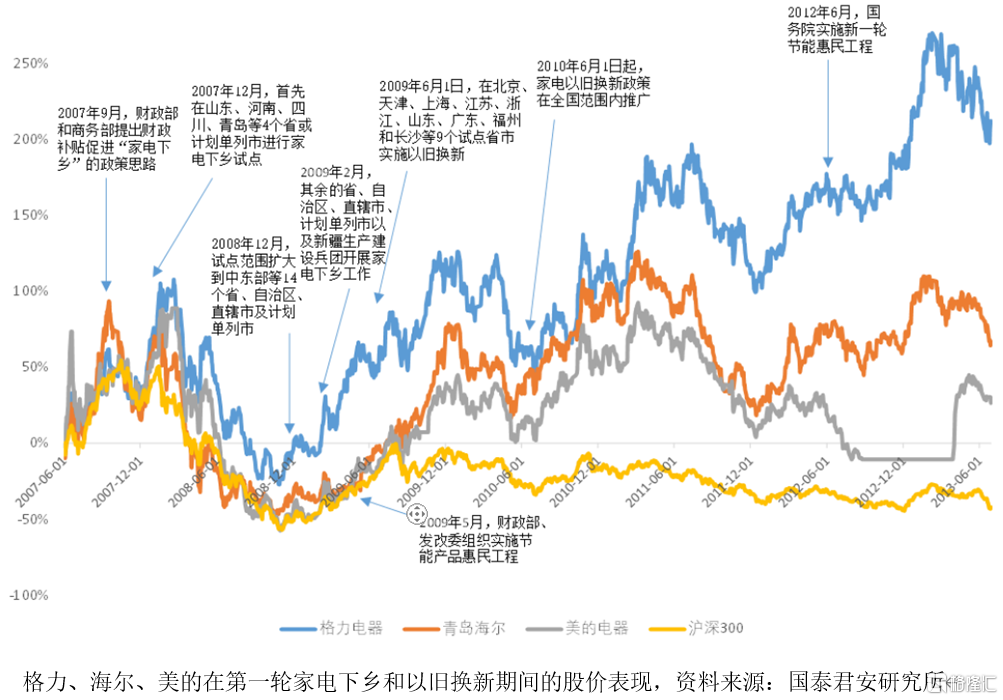 第一轮家电下乡开始于2007年12月,国家率先在山东、河南以及四川三省实施试点,对消费刺激效果明显,后于2008年 11月正式推广到全国。政策实施后,家电消费旺盛,渗透率也快速提升。政策试点时,家电股并未有多大起色,政策全国铺开时,家电股纷纷迎来走牛行情。