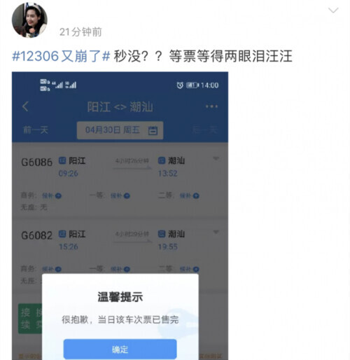 导读:随着五一假期的临近,许多人已经开始制定旅行计划。按照目前全国铁路车票15天预售期,今天是4月30日买火车票的日子。明天,每个人都可以买到5月1日的火车票。然而,就在很多人憧憬着去旅游、去玩的时候,却有网友纷纷表示票难求,连12306都崩溃了,相关话题迅速冲上热搜,引发了今年五一有望重现的讨论。
