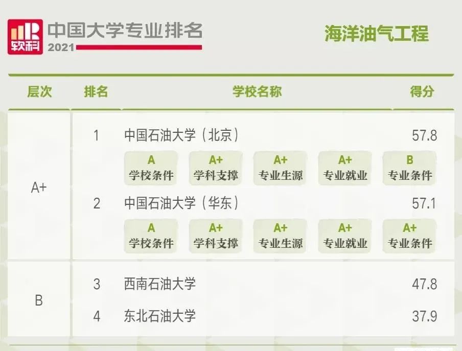 在海洋油气工程专业排名中,共有4所高校上榜,依次为中国石油大学(北京)、中国石油大学(华东)、西南石油大学、东北石油大学。