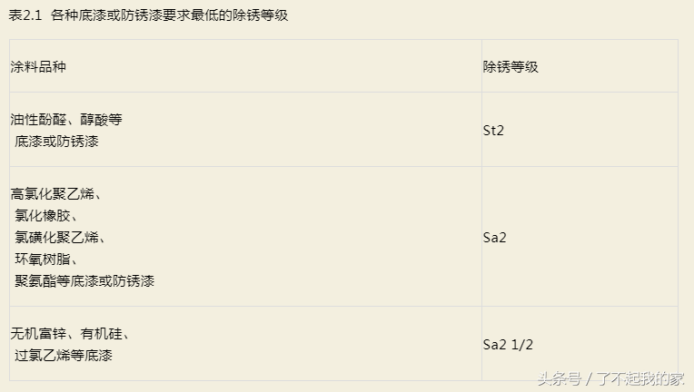 2.1、涂装前钢材表面除锈应符合设计要求和国家现行有关标准的规定。处理后的钢材表面不应有焊渣、焊疤、灰尘、油污、水和毛刺等。当设计无要求时,钢材表面除锈等级应符合表14.2.1的规定。