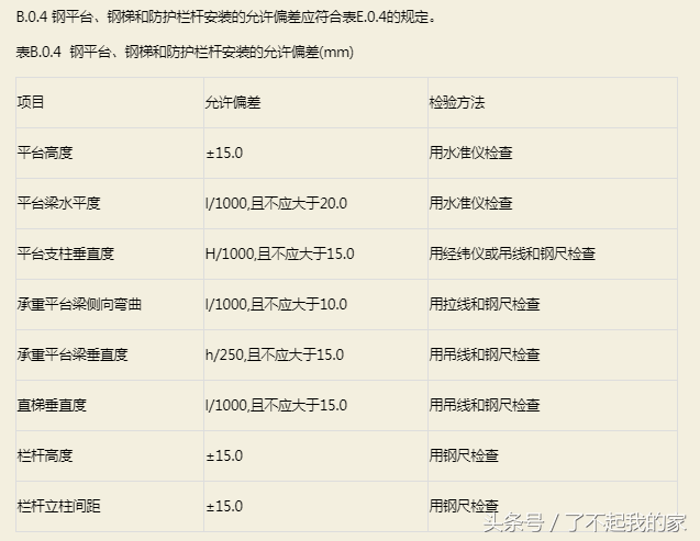 3.10、钢平台、钢梯、栏杆安装应符合现行国家标准《固定式钢直梯》GB 4053.1、《固定式钢斜梯》GB 4053.2、《固定式防护栏杆》GB 4053.3和《固定式钢平台》GB 4053.4的规定。钢平台、钢梯和防护栏杆安装的允许偏差应符合本规范附录E中表E.0.4的规定。