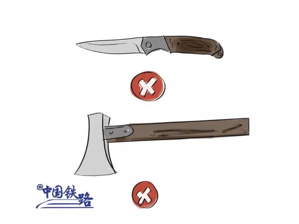 注意:水果刀、菜刀、屠宰刀、弹簧刀、多功能折叠刀、工艺刀等可能危及旅客人身安全的刀具,都不能带上火车。
