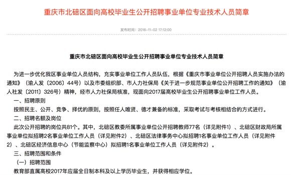 据了解,北碚区本次面向2017届高校毕业生公开招聘事业单位工作人员81名,其中区教委所属事业单位公开招聘教师77名、区财政局所属事业单位拟招聘2名、区法律事务中心拟招聘1名、北碚区经济信息中心(节能监察中心)拟招聘1名。
