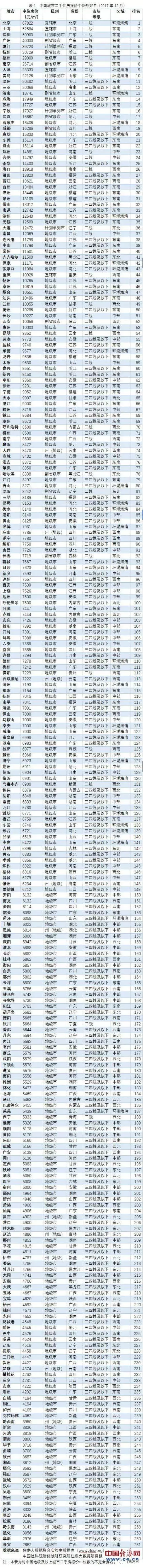 该项分析以来自互联网的430万条二手住房报价为基础,对2017年12月中国地级及以上城市二手住房报价中位数作了不完全样本排名。