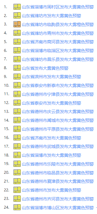 山东省气象台于2022年1月23日06时继续发布大雾黄色预警信号:目前,鲁西北、鲁西南和鲁中的部分地区已出现能见度低于1000米的大雾天气,局部地区能见度不足500米。预计23日早晨到上午,上述地区的部分地区大雾天气仍将持续。