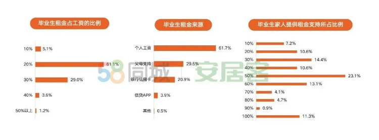 在安居客房产研究院的调研结果中显示,61.1%的毕业生会拿出工资的20%来租房,29.0%的毕业生会拿出工资的30%来租房。愿意在租房方面花费超过一半以上工资的毕业生占比仅为1.2%。在参与调研的毕业生中,三成需要父母家人的资金支持,其中11.3%的毕业生需要家人支付全部租金。