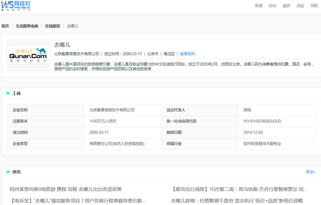 据网经社企业库(COP.100EC.CN)显示,去哪儿隶属于北京趣拿信息技术有限公司,该公司成立于2006年3月17日’法定代表人是陈刚。去哪儿网为消费者提供机票、酒店、会场 、度假产品的实时搜索,并提供旅游产品团购以及其他旅游信息服务。