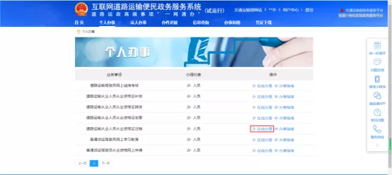 1.根据注册成功的账号、密码登录便民政务服务网站,在“个人办事”模块的业务事项中找到“道路运输从业人员从业资格证变更”办理,点击“在线办理”。