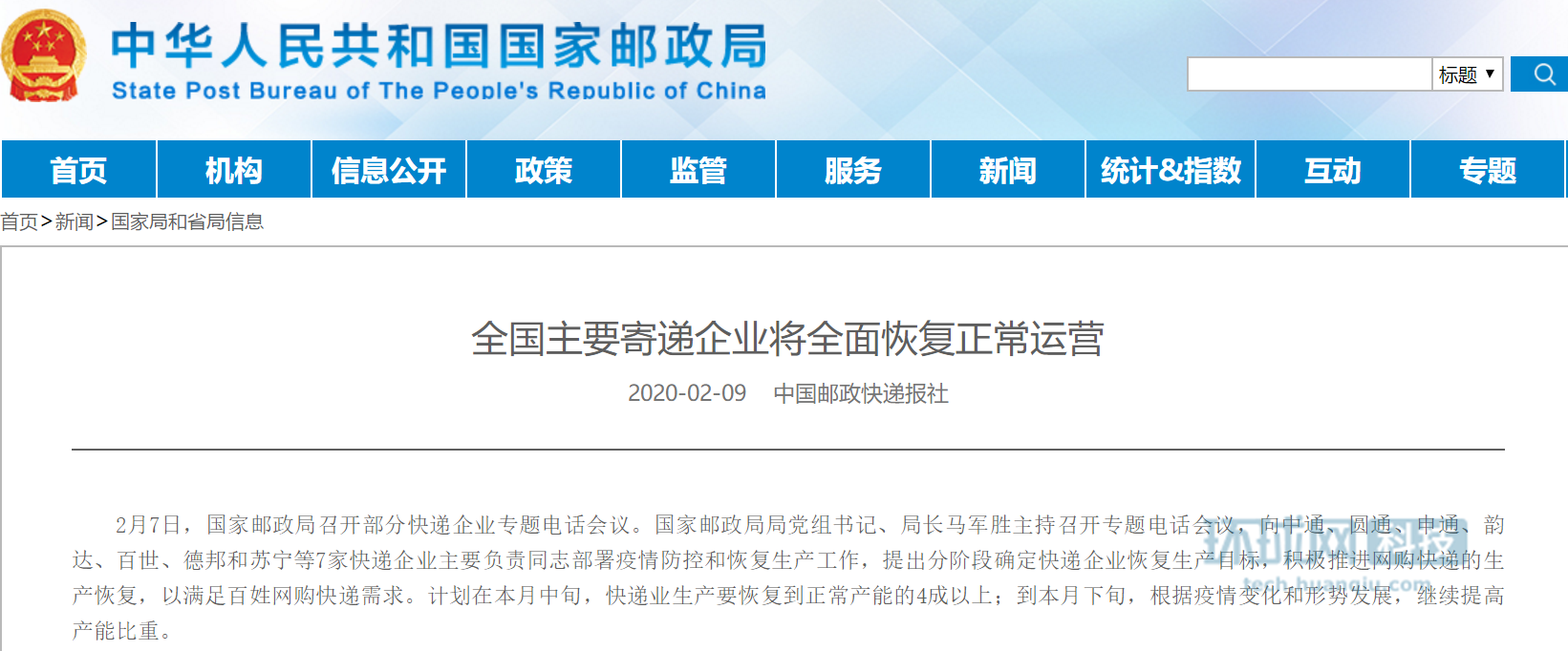 据了解,2月7日,国家邮政局召开部分快递企业专题电话会议。国家邮政局局党组书记、局长马军胜主持召开专题电话会议,向中通、圆通、申通、韵达、百世、德邦和苏宁等7家快递企业主要负责同志部署工作,提出分阶段确定快递企业恢复生产目标,积极推进网购快递的生产恢复,以满足百姓网购快递需求。计划在本月中旬,快递业生产要恢复到正常产能的4成以上。