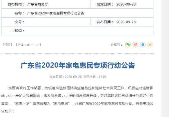 10月1日,广东省2020年家电惠民专项行动暨广州家电消费促进月活动启动活动举行。此次家电惠民专项行动补贴期限为10月1日起至12月31日结束(或财政预算资金使用完毕则提前结束),是原家电下乡政策的升级,补贴对象扩大至全省户籍居民,并增补了第二批参与企业。