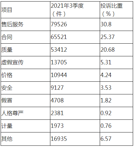 根据全国消协组织受理投诉情况统计,2021年第三季度全国消协组织共受理消费者投诉258,232件,同比增长17.43%,解决199,611件,投诉解决率77.30%,为消费者挽回经济损失33,514万元。其中,因经营者有欺诈行为得到加倍赔偿的投诉2,929件,加倍赔偿金额166万元。接待消费者来访和咨询13万人次。