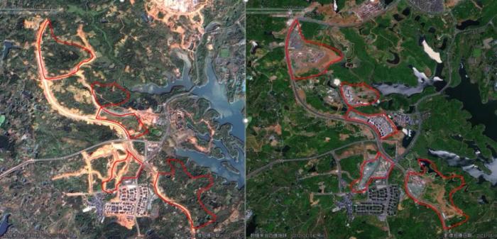 左侧为2019年4月卫星影像图,黑龙滩饮用水水源准保护区内部分土地尚未开发利用,植被覆盖较好;右侧为2021年8月卫星影像图,该区域内有大量房地产项目开发建设,影响生态系统的原真性和完整性