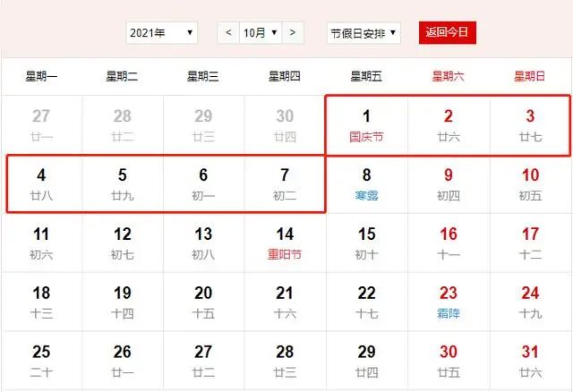 2021年国庆节放假时间 2021年10月1日(周五)-10月7日(周四)放假,共7天。2021年9月26日(周日)、10月9日(周六)补班。