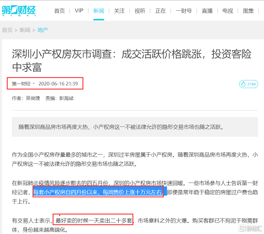 其实早在去年6月,第一财经就曾调查过深圳小产权房,“价格成交非常活跃,价格出现跳涨,每套小产权房自4月份以来,每周售价上涨10万元左右,并且每天市场成交旺盛的时候能够卖出20多套。”