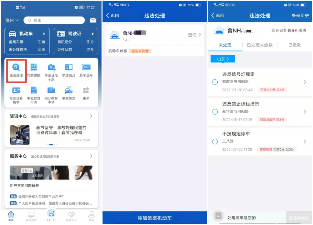 2、登录"交管12123"APP后,通过点击【违法处理】,进入违法处理业务流程。