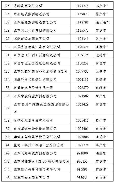 数据显示,民营企业200强入围门槛达58.6亿元;制造业民营企业100强入围门槛达76亿元。 从经营效益看,入围200强民营企业,2020年度营业收入总额达6.89万亿元,资产总额4.93万亿元,利润总额2541.37亿元,税后净利润2025.25亿元。13家企业营业收入突破千亿元。入围创新100强民营企业,2020年度主营业务收入7715.64亿元,实现利税887.69亿元,平均销售利税率达11.51%。 从社会贡献看,入围200强民营企业,2020年度纳税总额达1910.4亿元,纳税额超10亿元的企业共36家;员工总数331.57万人,员工人数超1万人的企业共73家。 从创新引领看,入围200强民营企业,2020年度研发投入总额达到725.4亿元。入围创新100强民营企业,2020年度研发经费内部支出占销售收入比例平均达3.52%,研发人员占从业人员比例达15.72%;新产品销售收入占总收入比重平均达45.84%。入选企业均为高新技术企业或核心子公司为高新技术企业,均建有研发机构;全部拥有自主知识产权,户均拥有有效专利392.41件,户均拥有有效发明专利121.98件。创新100强企业中,有44家列入省级创新型领军企业培育库,有43家获得过国家或省科学技术进步奖,有67家企业参与或主持过国家标准或国际标准的制定,在行业内具有较强的影响力和带动性。 从产业结构看,入围200强民营企业,第二产业入围企业162家,其中,制造业企业115家,占据主导地位。房屋建筑业、批发零售业、黑色金属冶炼和压延加工业入围企业均超过20家,化学原料和化学制品制造业、金属制品业、电气机械和器材制造业、计算机、通信和其他电子设备制造业入围企业均超10家。入围创新100强民营企业,先进制造与自动化、新材料、电子信息3个行业入选企业数较多,分别达31家、23家和19家。 从地区分布看,民营企业200强入围企业分布在13个设区市。其中南京市22家、无锡市34家、徐州市3家、常州市22家,苏州市47家、南通市32家、连云港市6家、淮安市2家、盐城市2家、扬州市10家、镇江市11家、泰州市8家、宿迁市1家。民营企业制造业100强分布在12个设区市,其中苏南80家、苏中8家、苏北12家。民营企业创新100强分布在13个设区市,其中苏南79家,苏中12家,苏北9家。