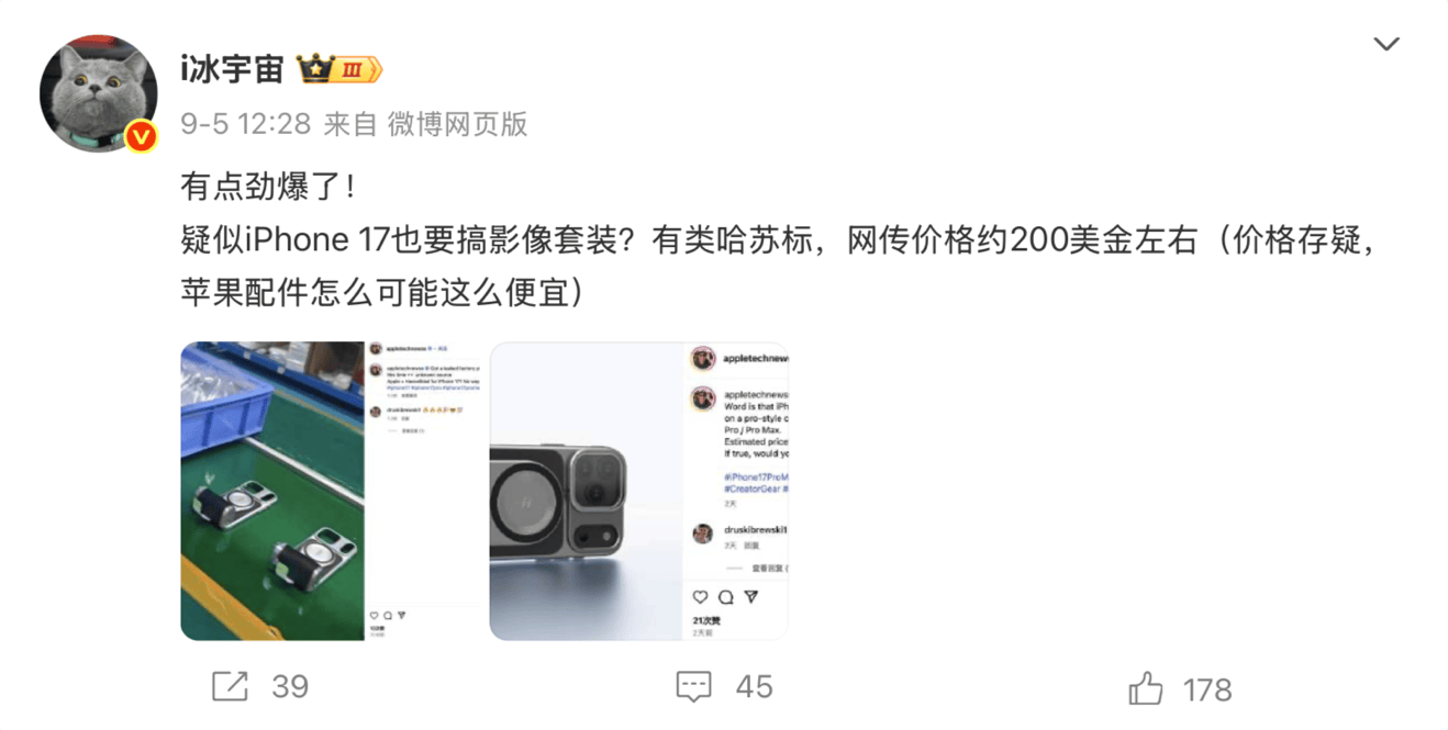 近日,一则关于 iPhone 17 的影像配件消息在社交平台上引发关注。9 月 5 日,知名博主“i冰宇宙”转发外媒爆料称,苹果或将推出带有哈苏标识的影像套装,价格约为 200 美元。相关图片显示,该产品配有磁吸手柄,并出现类似哈苏的 “H” 标志,因而被误认为是联名产品。