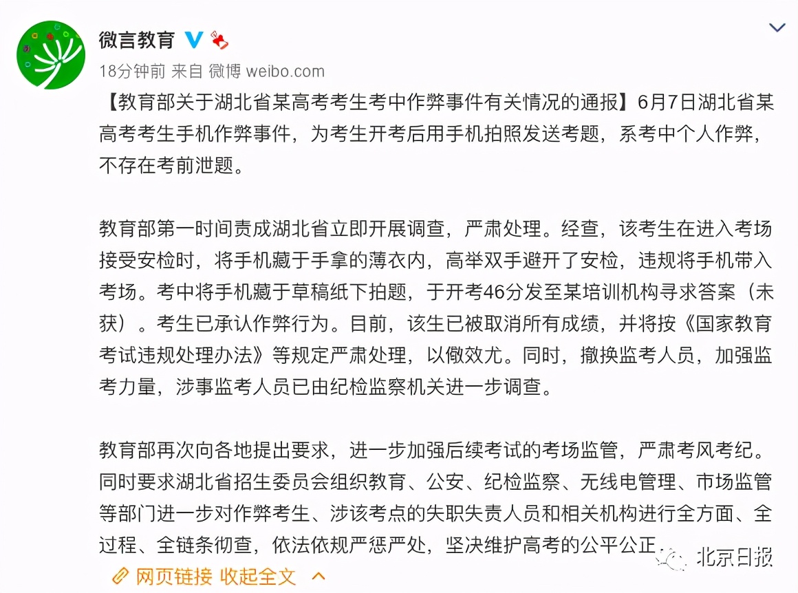 6月9日凌晨2时许,据教育部新闻办公室官博@微言教育 通报,6月7日湖北省某高考考生手机作弊事件,为考生开考后用手机拍照发送考题,