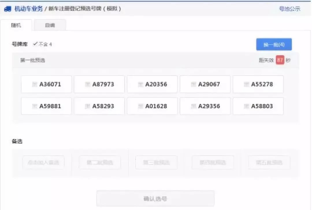用户可以点击右上角“换一批”按钮重新进行随机(“换一批”后面的括号中的数字为用户当前选号车辆的剩余随机选号次数),此时会更新随机号牌栏中的号牌。 如果备选号牌栏中有号牌并且没有失效,则备选栏中的倒计时将重新开始倒计时。