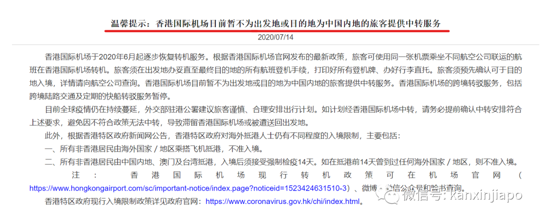 2020年7月14日,中华人民共和国外交部驻香港特别行政区特派员公署发文提醒中国公民,香港国际机场将不会为出发地为中国的旅客提供中转服务。