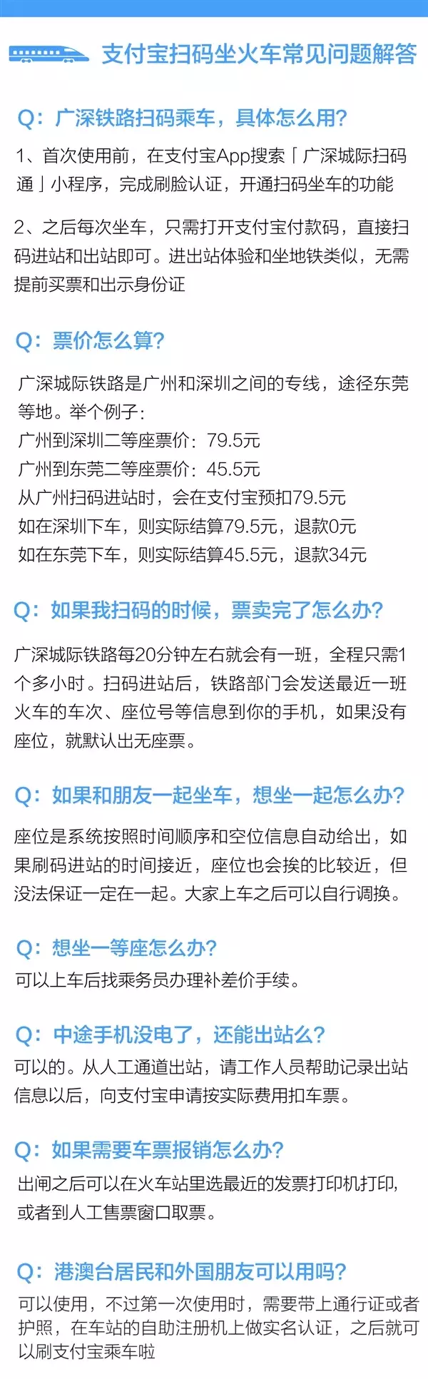 目前,广深城际铁路全线各站都已支持支付宝扫码乘车。乘车前,乘客打开支付宝APP,搜索“广深城际扫码通”,按照提示刷脸完成身份认证,开通相关功能。