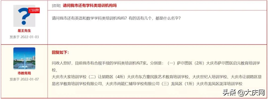 导读: 问题:我市有英语和数学培训机构吗?有多少,如果有的话?他们叫什么名字?1月7日,市教育局回复:您好,我市目前有7家学科培训机构有合规手续。 分别是:(1)萨尔图区(2) 大庆市萨尔图区启元教育培训学校,大庆市大家培训学校(2)让胡路区(4) 大庆市东方儿童民族。