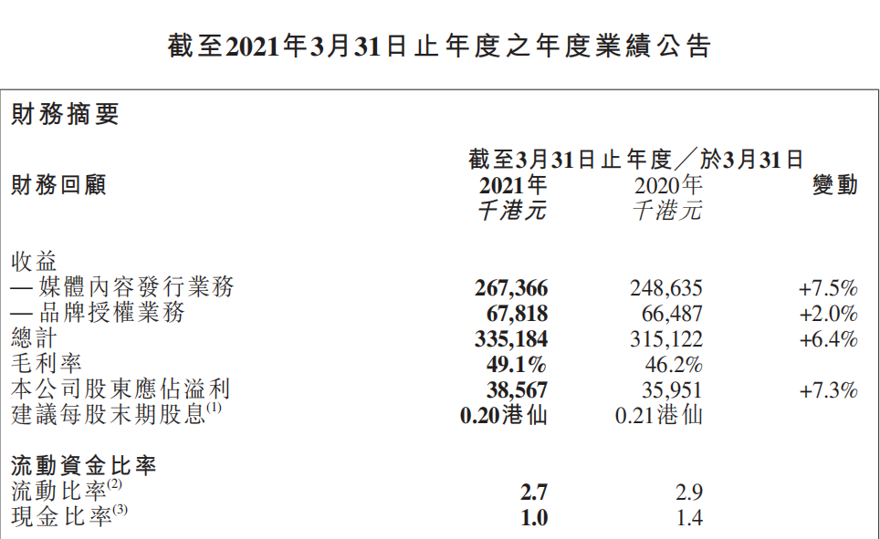 据羚邦集团2021年6月30日发布的财报数据显示,截至2021年3月31日止的年度业绩,羚邦集团实现收益3.35亿港元,同比增加6.4%。其中,媒体内容发行收入为2.67亿港元,品牌授权收入为6781.8万港元。