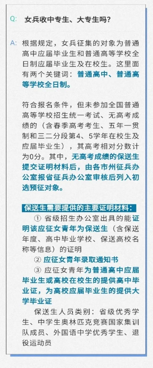 根据规定,女兵征集的对象为普通高中应届毕业生和普通高等学校全日制应届毕业生及在校生。这里面有两个关键词:普通高中、普通高等学校全日制。