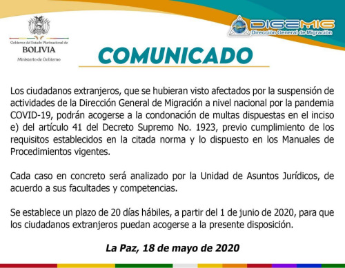 3、拥有玻利维亚居留身份但逾期滞留境外的外国公民,其居留身份将不被撤销,但请于6月1日起20天内更新相关证件。